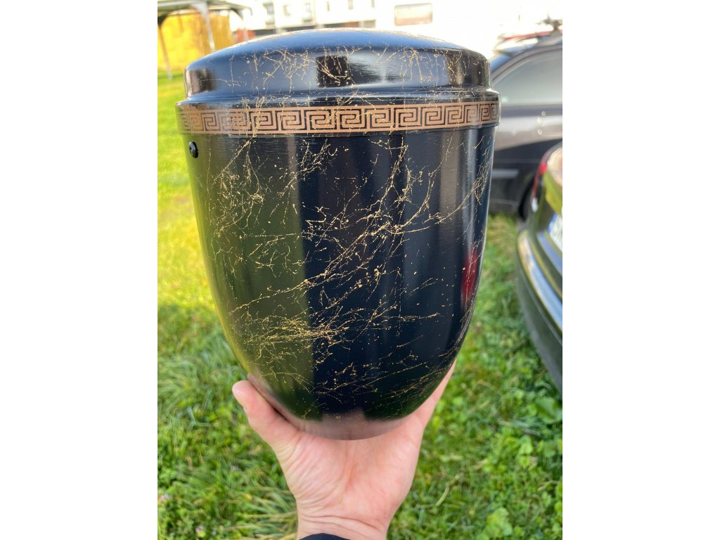 Půlnoční pozlacená urna je elegantní a tajemná nádoba vyrobená z hliníku a zdobená zlatým mramorováním, které se vlní a kroutí jako úponky tekutého kovu. Kontrast mezi tmavou a sytou černou barvou a zářivým, lesklým zlatem vytváří působivý vizuální efekt a navozuje pocit luxusu, sofistikovanosti a půvabu. Hladký a leštěný povrch urny spolu s jejím zaobleným tvarem a robustním vzhledem z ní činí krásný a funkční předmět pro uložení popela. Ať už bude vystavena na krbu, na polici, v kolumbáriu, nebo na hrobě, urna jistě zaujme a inspiruje svou nadčasovou krásou a půvabem.